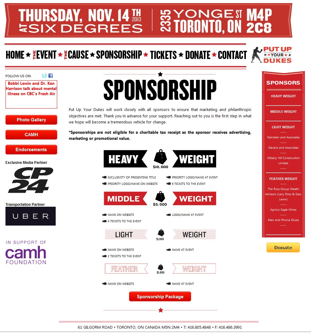 Put Up Your Dukes will work closely with all sponsors to ensure that marketing and philanthropic objectives are met. Thank you in advance for your support. Reaching out to you is the first step in what we hope will become a tremendous vehicle for change.